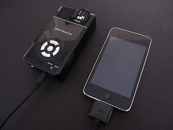 So those are the basic facts, and without belaboring the point, we’ll say this much: if you can see yourself doing photo-based presentations or watching videos in pitch-black rooms with flat display walls, P1 Pico isn’t a bad option. It’s the first iPod- and iPhone-compatible mini-projector we’ve tested, and it delivers on its promised 640×480 resolution to enable the display of either still or video imagery that’s as detailed as current models are capable of putting out, at larger sizes than any other portable device out there. But there are some serious caveats that any potential buyer needs to know about first—ones that would take P1 Pico totally out of contention for our purposes, and quite possibly for yours as well.
