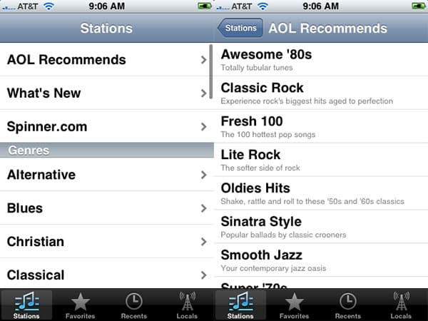 The other major free Internet Radio app currently available for the iPhone and iPod touch is AOL’s AOL Radio (Free), which takes a different—and more conventional—approach to performing music. Here, the idea is that AOL will serve directly to your iPhone or iPod touch a list of hand-selected stations that will play like traditional radio on your device. It provides them from a list of familiar genres, along with a short collection of “recommended” stations that pares down the wide variety into a short list of popular options.