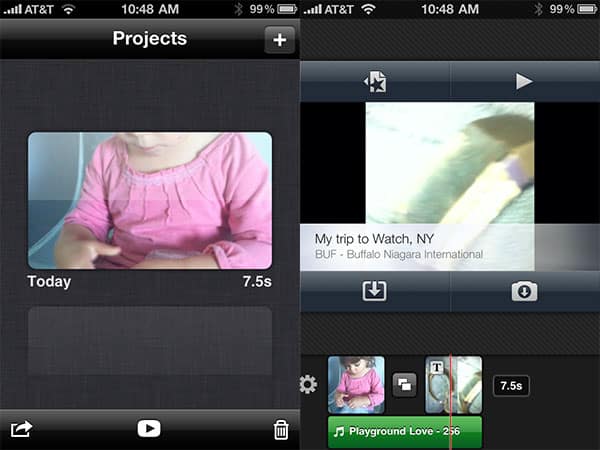 Pieces of video can be cut down with pin-style start and end points, spliced together with a song and dissolving or Ken Burns effected pictures from your iPhone’s Photos and iPod libraries, and then saved as a fully assembled clip for sharing. All you need to learn is how to tap on each of the pieces of footage in your timeline, drag to reorder them in your preferred sequence, and make small tweaks to their transitions.