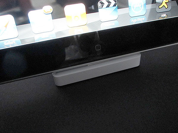 There’s one and only one reason that we wouldn’t rush to recommend the all-Apple solution, and that’s the iPad Dock’s slanted lip. It is, like the original iPod Dock, precision fit to a specific maximum depth of a specific unencased Apple product. If you want to use the iPad Dock with an unencased iPad, it works without a problem; Apple has actually designed the dock with a little rubber pad around its male Dock Connector, and the iPad with a tilting female Dock Connector port, enabling users to tilt the iPad forward while removing it without breaking either the iPad Dock or the iPad itself. But because the hard white plastic lip doesn’t have any give, the docking system doesn’t work when you try to use it with an iPad case. Even the thinnest of the dozens of cases we’ve received for testing doesn’t fit properly.