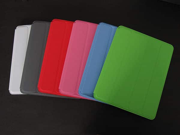 iPad Smart Case comes in six colors: light gray, dark gray, blue, green, and pink all match the current polyurethane Smart Cover options, while a bright red PRODUCT (RED) edition has been added to the mix as an Apple Store exclusive. Apple chose to use the same material as the less expensive Smart Covers rather than higher priced leather, and consequently, it has the same rubbery feel. Just as was the case with the first-generation iPad’s official iPad Case, the polyurethane feels somewhat cheap, but your fingers will quickly get used to it, even if you’re not thrilled by the texture.