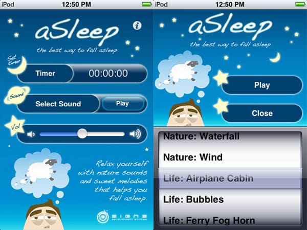 aSleep has more sounds—49—and a nicer-looking, if less feature-laden interface. You still get a timer with minute-level control over turning on or off, but there aren’t any settings for fade effects or behaviors once the timer expires; there’s also a volume control that affects the headphone port and Dock Connector.