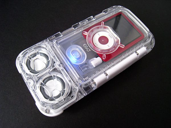 As Otter and other companies are aware, an $80 price tag can buy a lot of iPod case—a fact that Atlantic has used to serious advantage in its new EGO iceBar2 ($80). Here, those dollars get you not just a waterproof iPod nano case—one that’s incidentally compatible with first-, second-, and third-generation iPod nanos—but also a pair of legitimately nice, battery-powered speakers, an integrated rear stand, a rubber wrist strap, and a matching little buoy. The resulting product, which can be taken into the shower, used in a pool, or safely enjoyed on a beach, is a real stunner: a fun, affordable little iPod speaker that delivers more convenience and better value for the dollar than the company’s earlier iPod-agnostic Music Showcase.