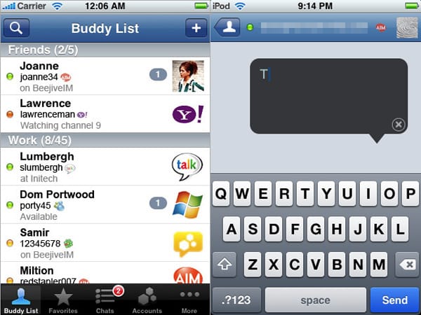 BeejiveIM ($16) is perhaps at once the most polished, complete IM app for the iPhone and iPod touch, and the most overpriced. It offers compatibility with AIM, Google Talk, ICQ, Jabber, MSN/Windows Live, MySpace, and Yahoo! messaging, and like the majority of its competition, uses a bottom-tabbed interface to let a user navigate between a buddy list, favorites, active chats, accounts, and more options. The accounts page offers edit and add buttons at the top, along with a list of current accounts, each with its own status bar, letting the user set online/offline status independently for each service.
