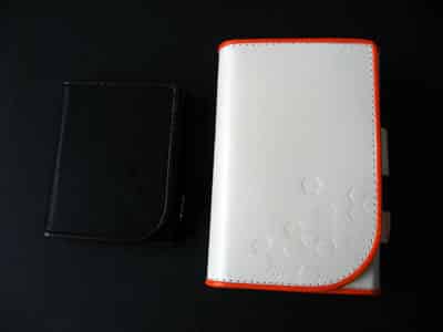 Of all of the cases, the nicest-looking are Belkin’s book-style flip-shut Leather Folios. Like several of the company’s earlier iPod cases, the Folios feature a clean, modern embossed honeycomb design that can be seen on both the leather exterior and suede interior, and rounded piping that runs around the edges in an interior-matching color.