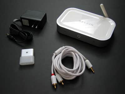 By comparison, TuneStage as sold only plays through your stereo, and is neither portable nor equipped with headphones. Its receiver is the size of a small router, plugs into a wall with an included power adapter, and connects to your speakers with an included stereo RCA-to-minijack cable. The cable is gold-tipped, seven feet long, and in fact can be connected either to RCA or minijack ports on the receiver’s rear, depending on what you’re connecting to TuneStage. A power switch turns the unit on and off to conser power. Additionally, Belkin designed the bottom of the receiver to sit flat on a table or be wall-mounted, leaving a channel down its center and rubber screwholes for easy mounting.