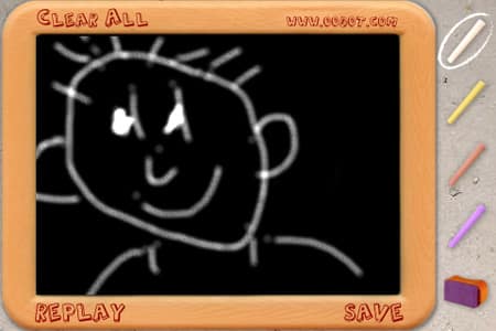 It offers buttons for selecting the chalk color or eraser, saving the drawing for a replay, replaying the strokes taken to create the last saved drawing, and clear all. The latter three buttons are placed on the blackboard frame.