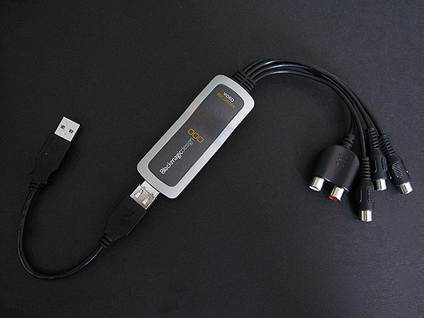 First things first: for those of us with certain video devices that output component video, Blackmagic Design’s Video Recorder ($149) for Mac users can be a godsend. It’s a tiny USB dongle with five female RCA-style inputs permanently wired in, two for audio, and either one or three for video. Connect a standard yellow composite video plug to the green port to record from most video sources, or hook up the red, green, and blue video connectors to component video sources. Support for the fading S-Video format is also possible via an optional adapter. A USB extension cable is included in the package.