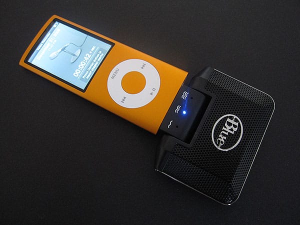 Though that’s a lengthy—and incomplete—introduction to Blue Microphones’ new Mikey ($80), the latest stereo microphone accessory for the iPod nano and iPod classic, it does help to explain why a company would even think of charging so much for a simple audio recorder. From one perspective, Mikey is only $10 more expensive than TuneTalk Stereo, the only good product left standing in the pocket-sized Dock Connector-based stereo audio recorder gunfight, and it promises to deliver superior audio performance. With the exception of an instruction booklet, nothing else is included in its package; you just get the black mic with its chrome edging and Blue logo. That’s it.