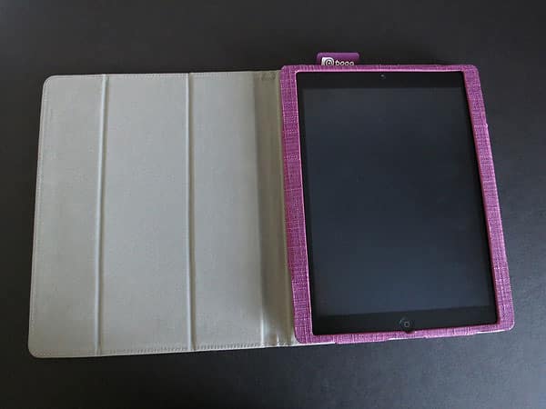 This new version is made of 100% natural fiber, with a grippy, rubbery material lining the inside. The texture of the outer material is rough—somewhat like canvas or hard denim—but not unpleasant, at least for some fingers. We found the bezel coverage to be kind of strange: rather than using consistently thick material around the iPad’s perimeter, this case has thin strips at the top and bottom with thicker edges around the left and right sides. It doesn’t affect performance, but it’s visually distracting. We’re not fond of how much of the tablet’s aluminum edges the holder leaves exposed, though, with all four corners bare plus a wider than necessary hole for the microphone. As is the case with many flat-backed folios, the Sleep/Wake and volume buttons are somewhat set back, yet still totally usable.