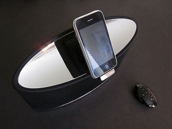 Let’s spend a moment discussing those curves. With Zeppelin, B&W transformed an elongated oval into a blimp-shaped ellipsoid covered with a mix of Spandex-like black cloth and chrome. For Zeppelin Mini, the company has extruded an oval into a tall tube, then lopped off one end on a diagonal. The sliced end reveals what looks to be the chrome metallic core, a curved mirror that reflects either the docked iPod or iPhone, or the unit’s surroundings, depending on the angle you’re sitting at.