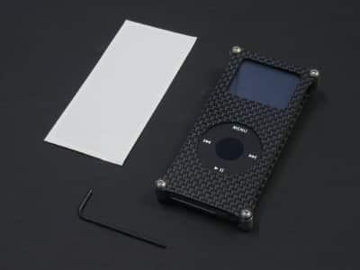 Pros: A simple semi-enclosure consisting of two thin plates of carbon fiber composite material, screwed together around the iPod nano with eight Allen screws and four aluminum posts. A strong detachable aluminum belt clip is included.