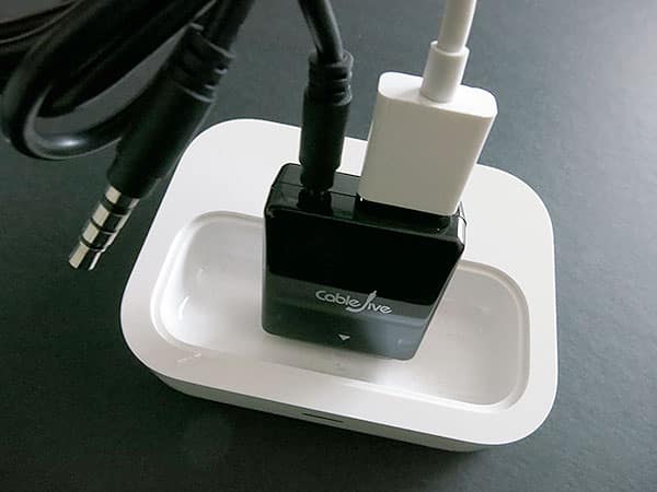 The idea is to fit it onto your speaker, dock, or other accessory, and then use a self-provided Lightning cable for both charging and audio from iOS devices, or add the provided audio cable to pass music to the speaker from other phones and tablets. CableJive includes a micro-USB cable to attach non-Apple devices for charging purposes.