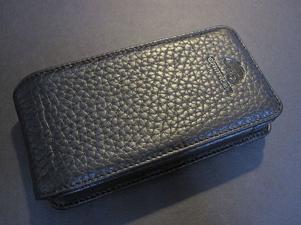 Camalen’s iPhone version of Hexa is a flip-open style case: the front cover is attached to the back and comes up from underneath, magnetically latching at the top when the phone’s not in use. While the floater leather in our review unit is very nice—soft cowhide with a bit of padding—the magnets are very visible, taking away somewhat from the overall appeal. There’s a leather frame to hold the phone in place inside, with the device slipping in through the top and secured by a snap. The frame covers the sides while leaving the bottom corners and most of the top edge exposed; it’s more protective than most, however, with coverage above the screen and alongside the Home Button, using one hole for the front camera and sensors.