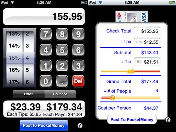 Additionally, CheckPlease offers an alternative interface—taken from its earlier version 2.0—that can be used to made a more precise tip calculation by subtracting the tax from the check’s total. While the second interface isn’t attractive, the fact that it’s there and works is great. And the app’s price is impossible to beat.