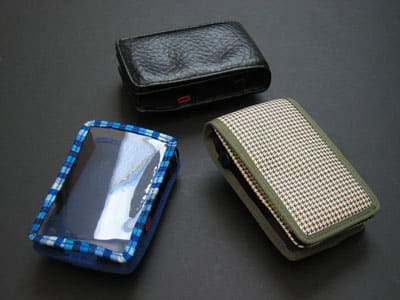 Flip Cases are iFrames with only two differences: they include a flap which covers all of the iPod’s top and front faces, holding closed with a Velcro strip on the case’s front bottom, and there’s a mesh and Velcro pocket on the inner portion of the flap that’s big enough to hold Apple’s earbuds. A circular metal ring is positioned at the top of the flap above the full-sized iPod’s headphone port. We saw versions in soft black leather and canvas fabric; Chums also sells a version in woven leather.