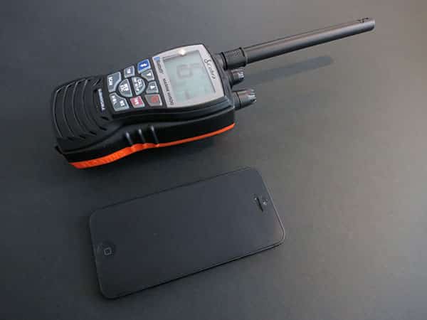 Pitched as an iPhone speakerphone and speaker alternative for marine use, Cobra’s IPX7-rated submersible and floating handset HH500 ($170) looks like a walkie-talkie and packs a 1/3/6-Watt VHF radio, rechargeable battery pack, and other useful features.