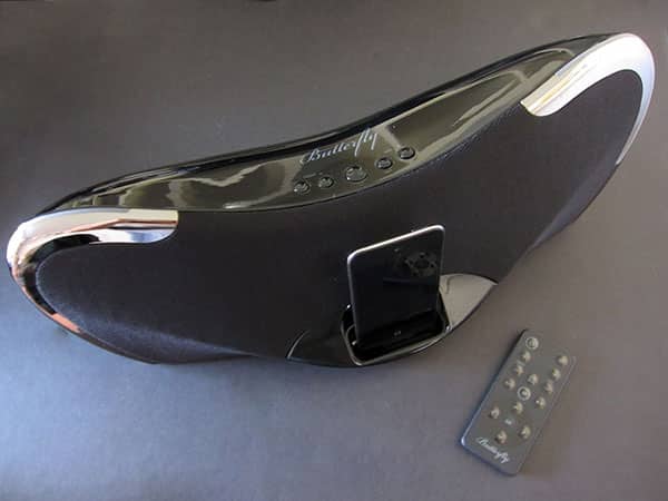 That group, of course, is budget-conscious consumers—people unaccustomed to finding eye-catching, sonically competent speakers below the $100 or even $150 price points—and they’ll be thrilled by Vitruvian and Butterfly. Coby doesn’t make a big deal about the specs of either of these systems, but they both include two 1-inch tweeters and two 2.75” full-range drivers that are hidden behind fabric grilles within largely black glossy plastic cases. Each one is roughly 16” wide, with Butterfly 0.4” wider and Vitruvian 0.1” narrower, featuring a central iPod/iPhone dock, power, volume, and lighting buttons on the top, and auxiliary and power ports in the back. Coby packs both with Infrared remote controls and wall power adapters, giving Vitruvian an audio cable, as well.