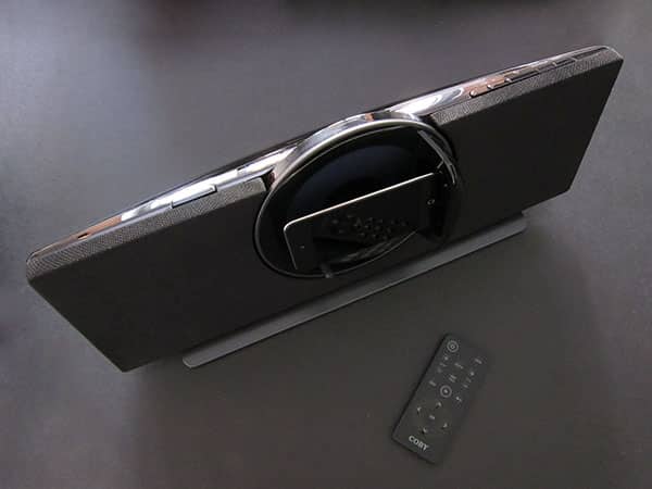 That group, of course, is budget-conscious consumers—people unaccustomed to finding eye-catching, sonically competent speakers below the $100 or even $150 price points—and they’ll be thrilled by Vitruvian and Butterfly. Coby doesn’t make a big deal about the specs of either of these systems, but they both include two 1-inch tweeters and two 2.75” full-range drivers that are hidden behind fabric grilles within largely black glossy plastic cases. Each one is roughly 16” wide, with Butterfly 0.4” wider and Vitruvian 0.1” narrower, featuring a central iPod/iPhone dock, power, volume, and lighting buttons on the top, and auxiliary and power ports in the back. Coby packs both with Infrared remote controls and wall power adapters, giving Vitruvian an audio cable, as well.