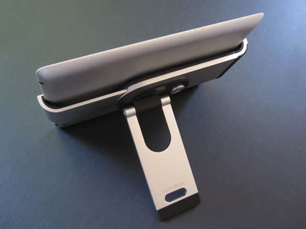 The core is a piece of aluminum, augmented with black rubber and plastic. It curves at the bottom to form a lip, which has an opening allowing for connector access. At the other end is an adjustable arm that clicks into heights designed to securely hold a bare iPad, or iPad mini; cases don’t fit. To unlock it, one simply presses down on the swirled metal button on the back of the stand.