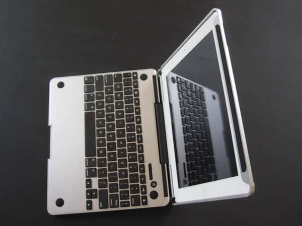 Like most keyboard cases, CruxSkunk is a folio-style design; the keyboard is located inside the front cover, and the iPad fits into a holder on the right. In this instance, the holder turns out to be a simple aluminum frame that only covers the edges of the tablet, while leaving almost all of the back exposed.
