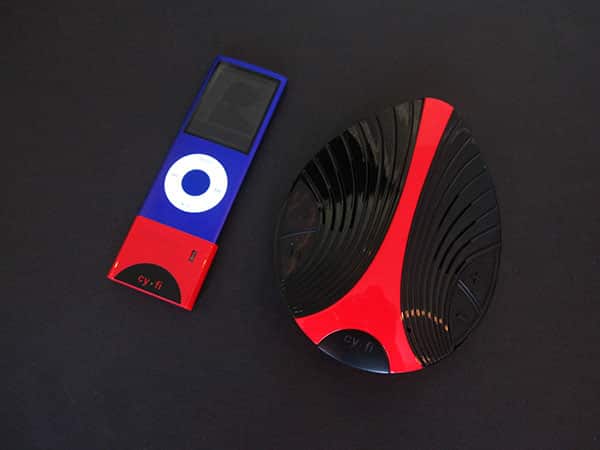 This is accomplished via a wireless transmitter that mounts on the bottom of the iPod, drawing power from the iPod’s battery; it uses Kleer 2.4GHz audio technology to send what’s said to be CD-quality audio from the iPod to the speaker. You can choose from three mostly black versions of Cy-Fi, differing in their red, black, or silver accents.