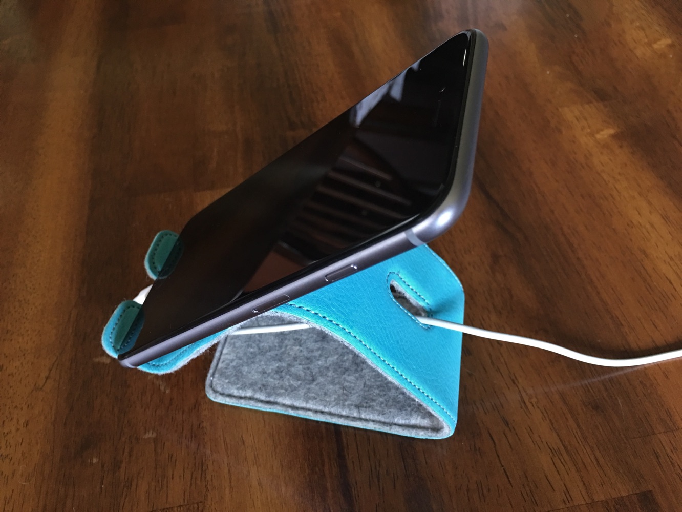 (The “aqua” stand we received is a nice departure from all the black stands and docks we see regularly.) An iPhone can be docked in portrait or landscape mode, and a small hole in the back of the stand allows a Lightning cable to be passed through for charging. Distil Union also includes a 6′ USB extension cable with Stanley. The stand can be folded up into a flatter shape when traveling to take up a small amount of space.