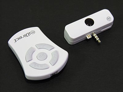 Like naviPod, iDirect’s receiver is a glossy white plastic, top-mounting iPod attachment with a black central circle that receives Infrared transmissions from a wireless remote control. Unlike naviPod, iDirect’s pass-through headphone port is mounted on its top rather than its rear, and it doesn’t include naviPod’s occasionally useful detachable metal mounting stand. For that reason, you’ll need to mount your iPod upright in something – such as a Dock – if you want to use iDirect.