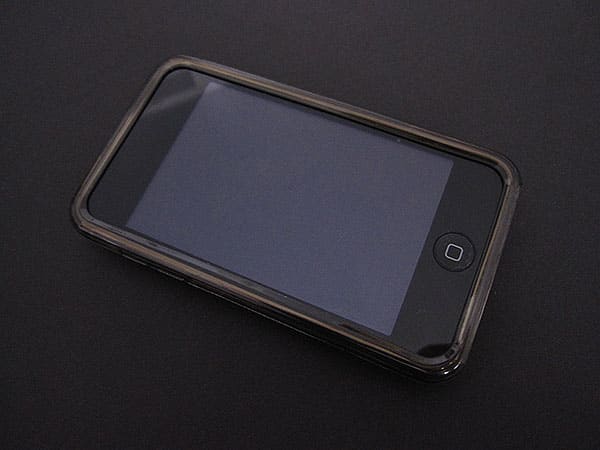 SoftShell is the smokey translucent version, refined. Resized for the iPod touch, it covers the device’s front bezel, top, sides, and bottom corners. It has no holes on its sides, top, or back; instead, it covers all of the iPod touch’s Sleep/Wake and volume controls. A clear piece of protective screen film is included to cover the device’s entire face, save for its Home button.