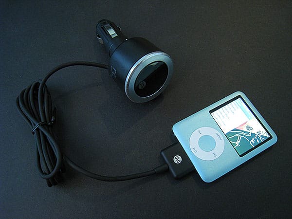 This year, TransDock Micro is a single-piece solution: a flexible car charging bulb with an integrated FM transmitter and a highly iPod case-compatible cable. The cable runs out of its bottom rather than its top, and what used to be separate buttons for FM station tuning have been replaced by a silver plastic dial that circles a blue-on-black display. By turning the dial, you manually change stations in .2 increments from 88.1FM to 107.9FM, and by pressing it inwards once, you activate Intellitune, a clear station finder. Intellitune takes 5 or 10 seconds to locate and tune itself to a clear local radio station, after which you set your car’s radio to match whatever’s on TransDock’s screen. In our testing, IntelliTune did a pretty good job of finding clear stations, and continued to hunt for additional options with every additional press, only occasionally doubling back on past results.