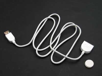 Each box contains three pieces: the cable, which is four feet long, gray in the center, and mostly white plastic on its male and female USB ends, plus two small circles of adhesive-backed Velcro. The USB Dock Cable’s “dock” – a white plastic version of the company’s iPod shuffle Cool Caps – uses a small bar of gray plastic to visually separate itself from the attached iPod shuffle, and has an embossed circle on its back to guide your attachment of one of the Velcro pads.