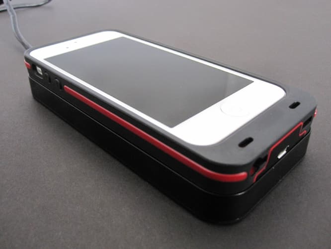 Here’s how the system works: you start by snapping the iPhone into the case, which has a 3” tall, 1.5” wide hole at the bottom. Offered in black with one of five accent colors, the case is polycarbonate plastic at its core, with surrounding rubber. Button protection is spot-on, with the Sleep/Wake and volume controls offering pleasant clicks when you press them.