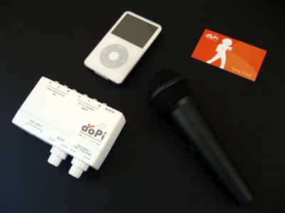 Halfway between Griffin’s iKaraoke and CAVS’ Karaoke Station IPS-11G is doPi Karaoke, a $60 package that – like IPS-11G – includes a large solo mic, a mixing box with dual microphone inputs and an echo filter, and the ability to output on-screen lyrics to a television set.