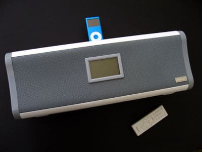 Since none of the speakers is a standout from other, similar options we’ve tested, our reviews will be comparatively brief: it suffices to say that all three are budget options with merely decent sound and aesthetics. Each boasts an integrated, blue-backlit clock, at least two speakers, an auxiliary audio input cable and port, and dock adapters for use with iPods, iPod nanos, and iPod minis. They’re all capable of running off of an included wall adapter or battery power, with bottom- or back-mounted battery compartments that become more demanding as the systems increase in size.