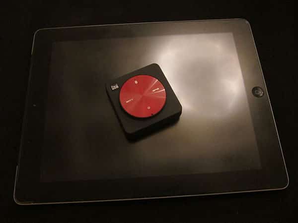 Looking a little like the old U2 iPods, XGPS150 is a rounded square box measuring roughly 2.2” wide and tall, bulging at its center from 0.5” to 0.75” in thickness. Lightweight and made primarily from matte black plastic, the unit’s face is dominated by a red swirled metal circle with four icons or words at its cardinal positions: north is Bluetooth, west is a battery indicator, east is a GPS signal indicator, and south is power. To turn XGPS150 on or off, you hold down the bottom of the circle until the lights go on; none of the other edges of the circle hide buttons. A tiny switch hidden in a mini-USB connector compartment below the power button toggles the XGPS150 between iOS and non-iOS device pairing modes.