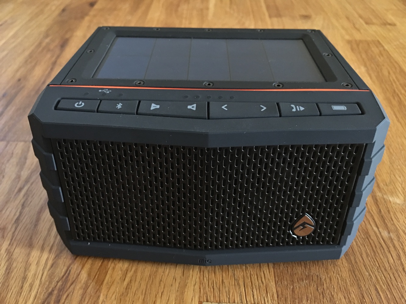 Sol Jam is a smallish speaker, weighing a bit more than 1.5 pounds, and measuring roughly 6.2” x 5” x 3”. A solar panel occupies the top of the speaker, along with a bunch of buttons — power, Bluetooth, volume, back, forward, play/pause/speakerphone, and battery level.