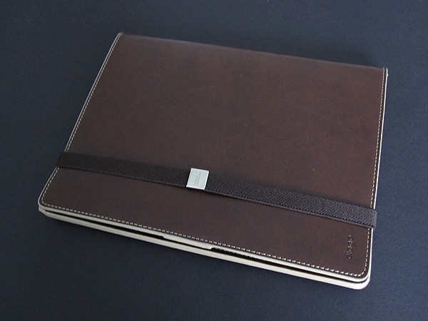 Although it tries to accomplish most of the same things, Note Leather Cover is not nearly as successful. From the outside, however, it does look nice. Rather than faux leather, Elago uses the real thing in both brown and dark brown. The contrast stitching that runs the along the edges and the spine is a nice touch. Instead of something built into the case to hold it shut, there is a removable elastic band included. We found irony in the “DESIGN IS IMPROVEMENT” message on its metal clasp, as we see this style of enclosure to be one of the least practical.