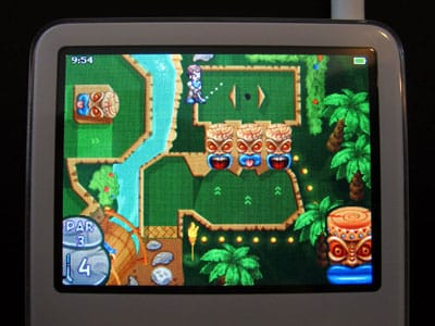 Golf games have come a long way in the past fifteen years, but you wouldn’t know it from playing Electronic Arts’ Mini Golf ($5), an overhead-view rendition of miniature golf that’s visually a few steps backwards from the golf games released for the Sega Genesis and Super Nintendo back in the late 1980s and early 1990s. EA has stripped this title down to the aesthetic core, doing away with split-screens, 3-D presentations, and special effects, regressing to a level that’s not even close to par for the iPod’s course. Only if you can ignore its poor audiovisual presentation will you realize that there’s a somewhat fun, though way-too-simple golf title here.