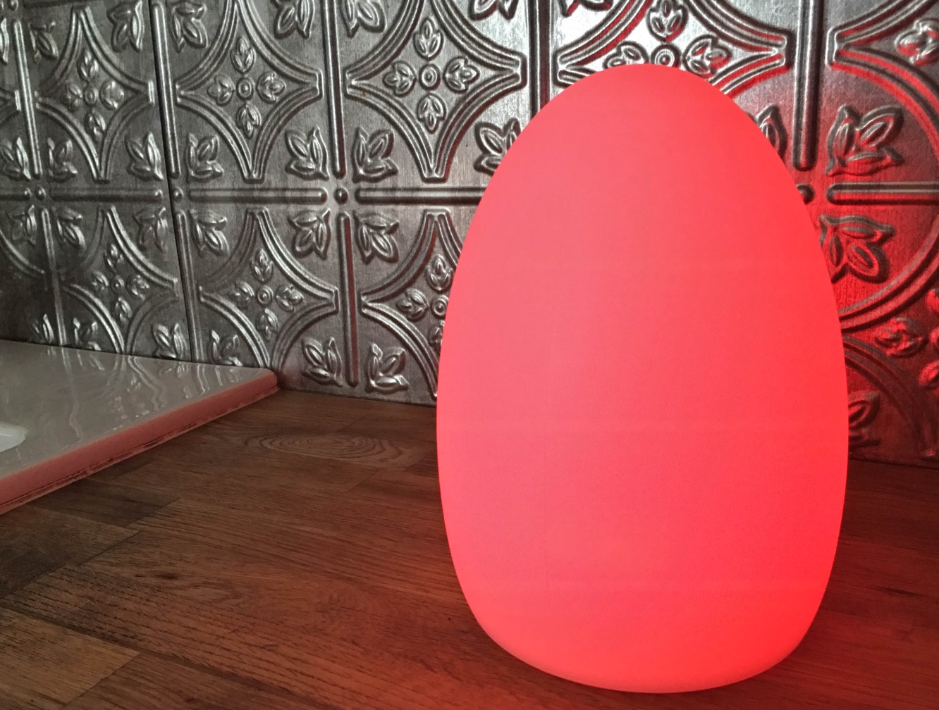 When not in use, Avea Flare looks like a big white gumdrop, or an egg — it’s plain, with a nearly seamless look, and it’s made of plastic. This enables the whole lamp to light up with a chosen color when called upon (which is when it turns into a big glowing gumdrop).