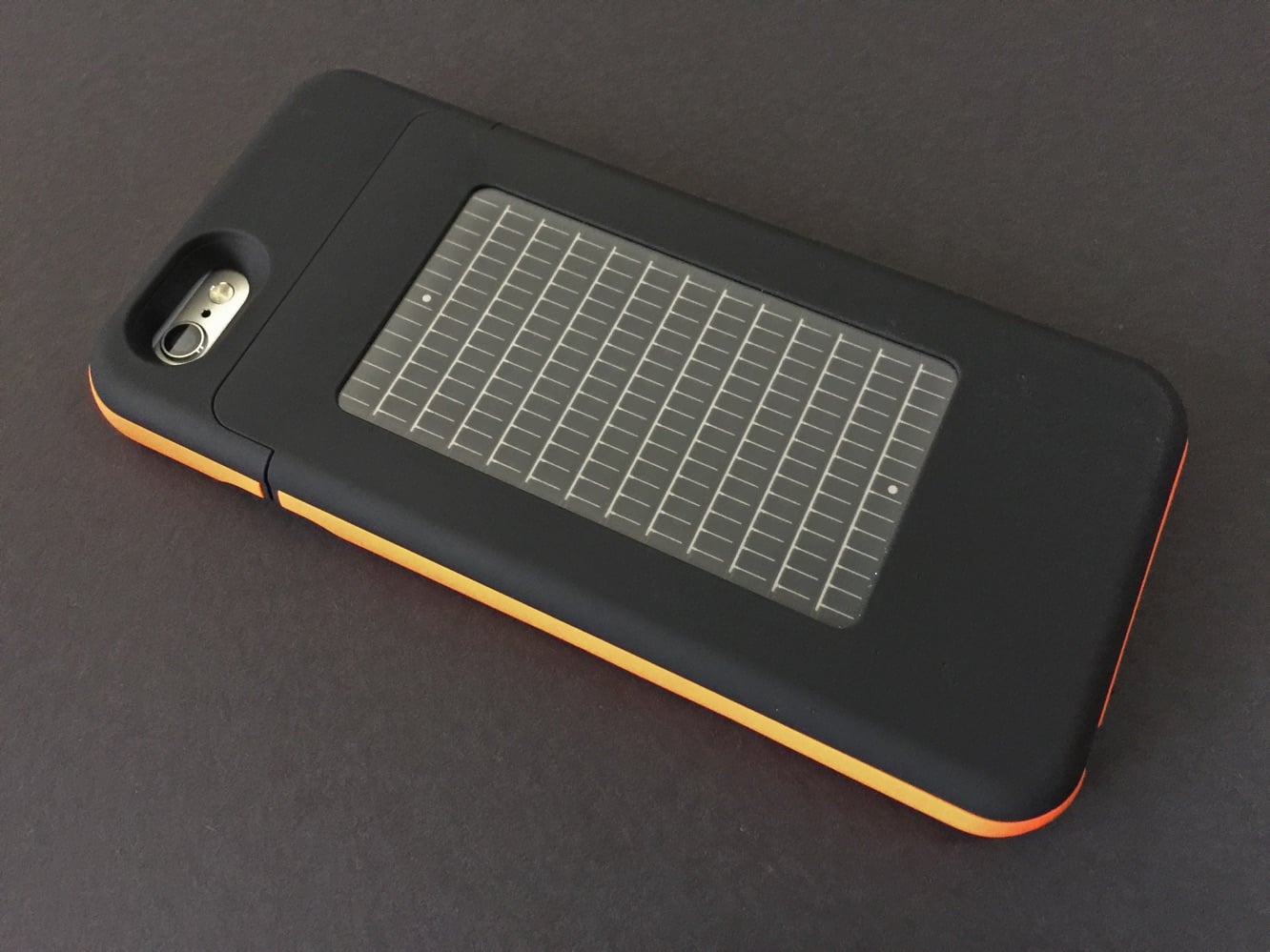 Lights on the bottom of the case denote how much battery life remains, and another nearby light turns red to indicate the solar panel is charging the case’s battery.