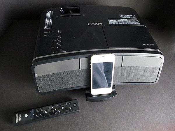 Additional settings, including brightness and more granular color controls, are found in clear, nice-looking menus that are only accessible via the included Infrared remote control, which works well but leads to one of the unit’s two user interface challenges. Epson deserves kudos for building MG-850HD with a clean, simple iOS device navigation menu that enables the Infrared remote control to access videos, music, photos, and settings very simply, but it doesn’t mirror the navigation buttons on the unit, nor does it allow iOS users to manually access their media while the device is plugged into the rear-mounted universal dock. The screen of apps such as Videos goes gray, indicating that the only means to control playback is through the accessory.