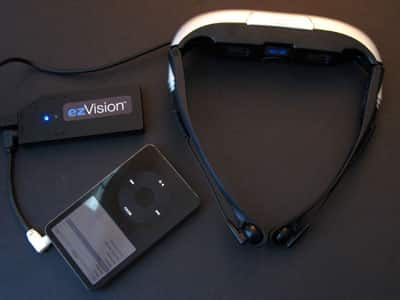 Like several other wearable video displays we’ve recently seen for the fifth-generation iPod, ezGear’s ezVision Video iWear is designed to let you watch videos (and/or photos) on your iPod without looking down at a small screen. Boasting “custom dual LCD optics” and an integrated eight-hour lithium-ion battery, ezVision can outlast the standard off-screen video playback time of current iPod models by a factor of two or more. Though it uses 4:3 aspect ratio displays, the company describes the visual effect as simulating the appearance of a 50″ widescreen at a 8.5-foot distance.