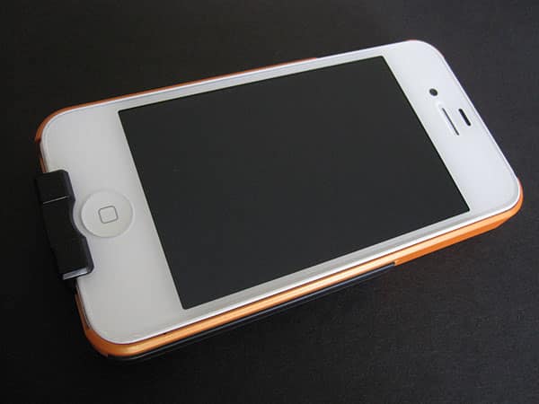 Maxx Spectra for iPhone 4/4S ($40) is the first product we’ve seen from newcomer FabX, and it’s another take on the traditional shell-style case we see quite often. The body has a pretty standard hard plastic construction, although there is an unusual pair of rubber strips on the inside to protect the iPhone, and another on the outer edges of the case.