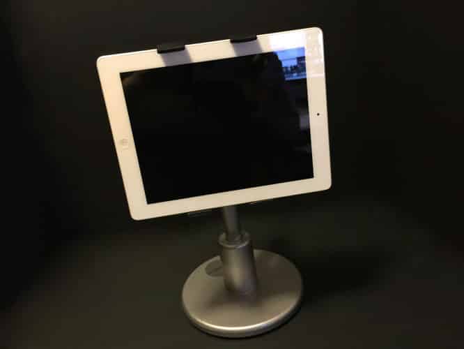 Once assembled, Orbit lets you turn the arm through 360 degrees of freedom, with or without pivoting the cradle on your choice of angle or device orientation. You cannot adjust the height of the arm or the tablet, apart from changing the tablet from portrait to landscape mode, but Orbit’s roughly 10” height is just right for elevating a tablet to a sitting user’s head level from the surface of a desk. You can optionally tilt the iPad upwards as needed for standing users. Theoretically, Orbit could be used as a digital check-in station at a hair salon or restaurant regardless of whether the user is seated or standing.
