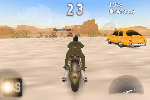 The last and simplest of the iPhone’s racing games is Freeverse’s Wingnuts Motoracer ($10). Unlike the other two, this is a motorcycle racing game where you can select from three characters and 10 tracks, which are unlocked one after another as you play. Motoracer’s inspiration isn’t Super Mario Kart, but an older Sega motorcycle game called Hang-On, which rather than giving you full freedom to turn around on a 3-D track basically optimized the gameplay to keep you going forward, and have you respond to things that come straight at you. Your goal here is to pass through multiple checkpoints before your clock runs out, staying as much as possible on paved roads, and avoiding obstacles that can slow you down.