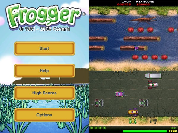 Konami’s iPhone Frogger is the original game with a new coat of paint. There’s a single screen divided into two halves, one with cars, the other with logs. You need to cross the highway full of cars starting at the bottom, jump on the logs, and land on one of several spaces at the top of the screen.