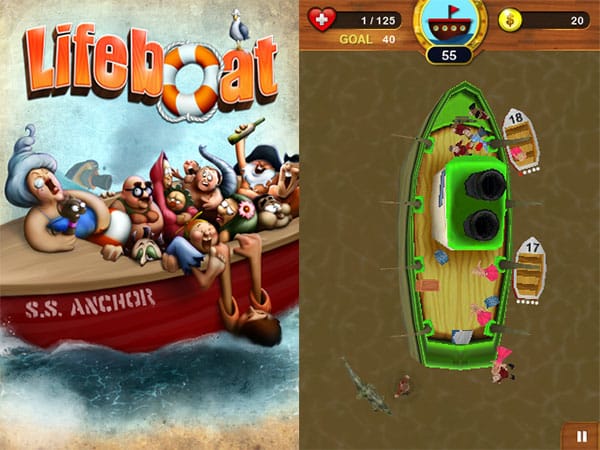 As little as we prefer to look at a game not as what it is but rather what it could or should have been, Lifeboat ($1) by Fuel Games is a title that almost immediately inspires such a reaction. Fire it up and you’re presented with a cartoony 3-D boat in the middle of the ocean, doomed to sink and loaded with passengers who need to escape — a great concept for any game, let alone a bargain-priced one. Your goal is to tilt the boat left, right, up, or down to direct its passengers from the boat’s cabin to the lifeboats that appear on its sides, filling the lifeboats with rescued people. It’s simple, casual fun, and it’s made even better by a secondary issue: sharks and crocodiles circle the boat, so if you tip the boat too much, you knock people into the water where they can be eaten or drown. Tap on them to bring them back on the boat, then try to get them into the lifeboats.