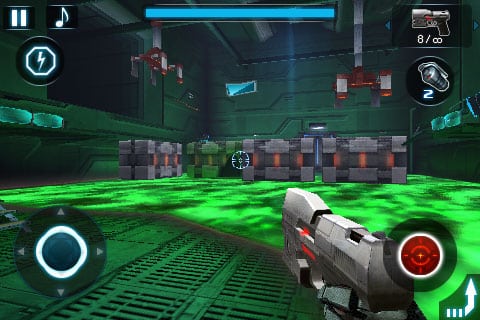 At some point, the explanatory dialogue in the Halo games became overbearing, and though Gameloft has come up with a storyline, it often lets you hear the details with voice samples while you’re playing, or briefly interrupts to show you a new area, rather than stopping the action for minutes at a time to advance the plot. You’re a space marine cut from the same general mold and suit of futuristic body armor as Halo’s Master Chief, sent on missions to wipe out aliens called “xenos” that have overrun a ship and planets or planetoids—near-orbital artificial satellites, the “N.O.” from the “N.O.V.A.” name. Control is handled through a virtual joypad for movement, swiping gestures for head-turning, and a set of buttons that are scattered around the screen: shoot and jump are at the bottom right, reload and grenades at the top right, plus a pulse zapper, music, and pause buttons at the top left. As with Halo, you have a “shield” lifebar that replenishes automatically when you’re not being shot at for several seconds, and an unlimited number of lives: the challenge is in advancing from checkpoint to checkpoint across 13 levels without dying. Doing so on “easy” difficulty will take perhaps eight hours; normal and hard difficulty levels are also available, and obviously more challenging.
