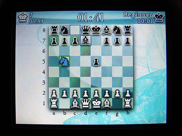 Unlike past chess-alikes such as Battle Chess and Archon, Gameloft’s presentation of the 600-year-old chess game is almost completely straightforward: this is a simple one- or two-player game of strategy, with no added action, special rule, or dynamic graphical flourish. You’re presented with a standard board, two control options (scrolling or 8-direction tapping), and nine skill levels ranging from “Monkey” to “Master.” The “beginner” level is actually number four out of nine, and not especially difficult for someone who has played a few games of chess, but you can go easier or much harder if you want, and also limit the computer’s thinking time to 1 second, 5 seconds, or infinite to further expand or contract its strategic options. Gameloft also includes a tutorial system, a two-player hand-off mode, the ability to watch 22 classic chess games, and a 10-challenge Quiz mode which isn’t especially compelling, presenting you with the choice of moves to satisfy simple puzzles.