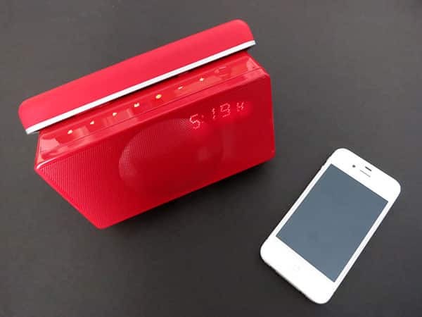 As with the Model S, the controls are illuminated through the unit’s top surface, and look really nice. This time, the buttons are all in a straight line, and Geneva has done a good job of insuring that they make sense: a bell lets you set an alarm, two arrows handle radio tuning and clock setting, an M button manages modes, a clock button brings up the clock, -/+ buttons are used for volume, and a dimpled button turns the power on and off. All of the buttons are responsive, and though they’re not a surprise given Geneva’s other systems, they’re a lot fancier than what you’ll see on other portable speakers.